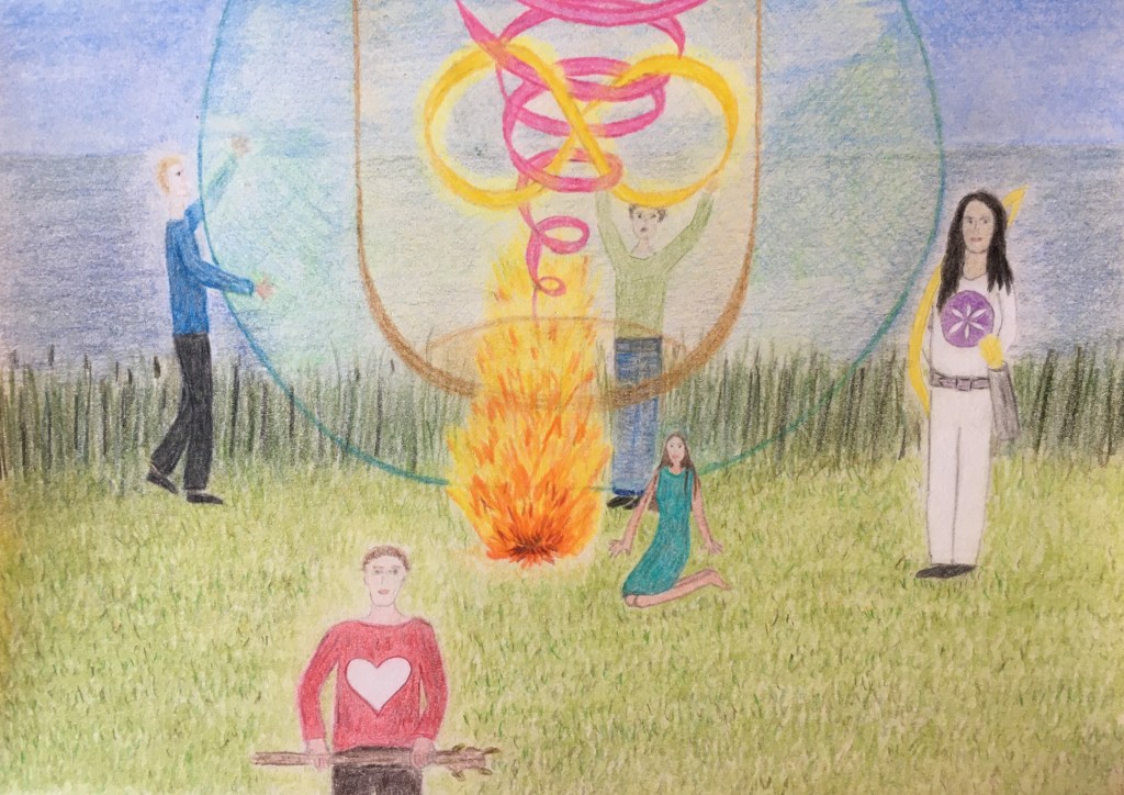 Ik heb er bijna een jaar over gedaan sinds aartsengel Anaël voor het eerst aan mij verscheen, om helder te krijgen wat hij nu eigenlijk precies doet. Ik heb hier de volgende tekening bij gemaakt. De tekening toont het alchemistisch proces en de leden van het kernteam. De precieze betekenis van de symboliek in de tekening, de rol van ieder kernteamlid en de werking van de alchemie leg ik uit onder ‘Indigo wijsheid’. Het komt erop neer dat de alchemie ons helpt om drie vuren in onszelf brandend te krijgen en te houden: het vuur van onze buik, ons hart en ons hoofd, symbolisch weergegeven in de tekening als het vuur, de brandende lemniscaat en de blauwe gloed van de bel.
